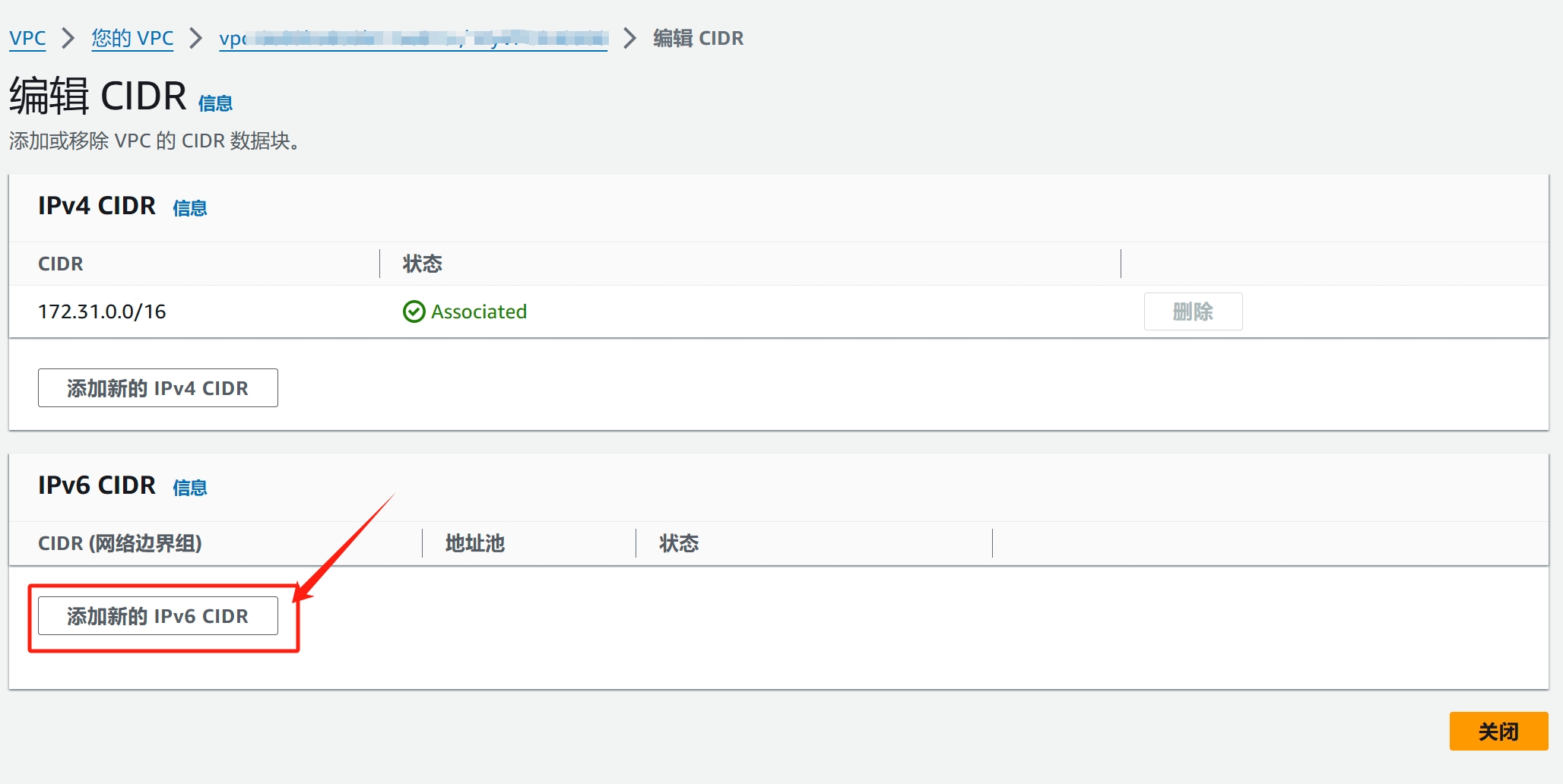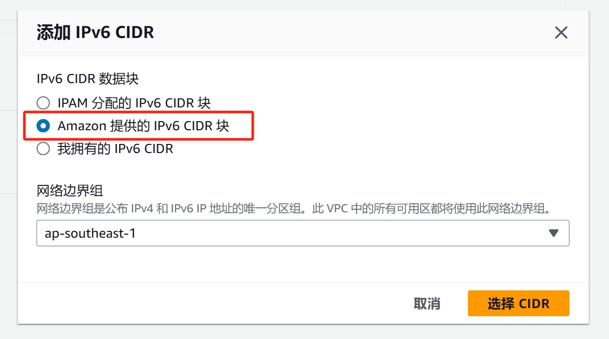 7、点击:【添加新的IPv6 CIDR】,然后选择【Amazon 提供的 IPv6 CIDR 块】,点击【选择 CIDR】增加