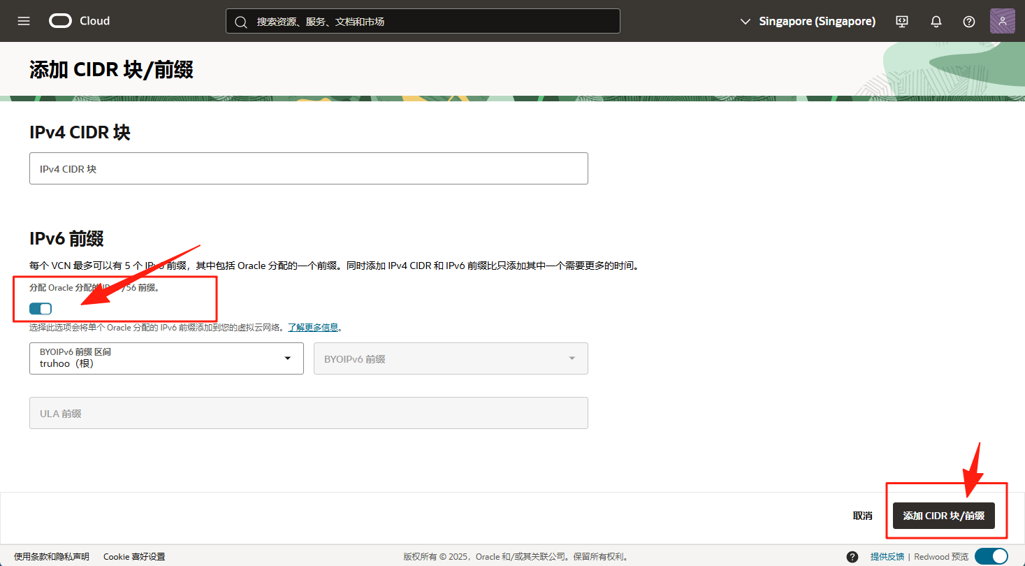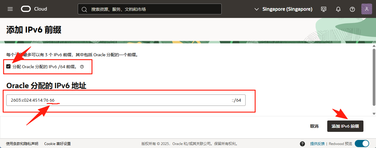 进入添加IPv6前缀页面,勾选分配 Oracle 分配的 IPv6 /64 前缀,在 Oracle分配的IPv6地址 字段,输入两个十六进制字符 (00-FF),如我这边我输入的【66】 ,点击右下角 添加IPv6前缀。