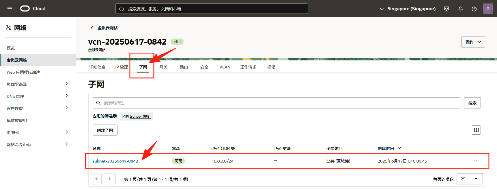 二、为子网 (Subnet) 分配 IPv6 CIDR 接下来,为实例所在的子网分配一个来自 VCN 的 IPv6 CIDR 块,通常是 /64。 还是刚才的 VCN 详情页面,点击菜单中的 子网 (Subnets),选择目标子网。