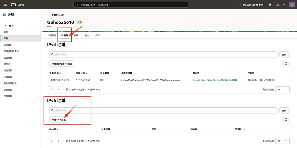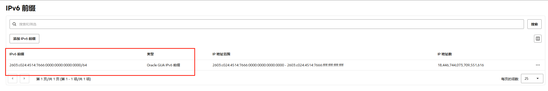 勾选 分配 Oracle 分配的IPv6 /56 前缀 (Assign an Oracle allocated /56 prefix) 的选项。这是最常见的方式。最后点击 添加 CIDR块。OCI 会自动为你的 VCN 指派一个全局单播地址 (GUA) /56 前缀,OIC会自动返回IP管理界面,稍等下,会自动刷新出IPv6地址。