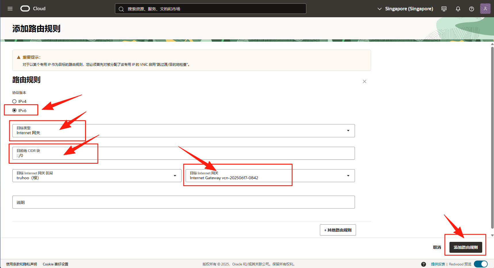 上图内容解释如下: 目标类型 (Target Type): 选择 互联网网关 (Internet Gateway)。 目标 CIDR 块 (Destination CIDR Block): 输入 ::/0 (这代表互联网上的所有 IPv6 地址)。 目标互联网网关 (Target Internet Gateway): 从下拉列表中选择附加到你 VCN 的那个互联网网关。 (可选) 添加描述,例如 “Allow IPv6 Internet Access”,完成后效果如下图: