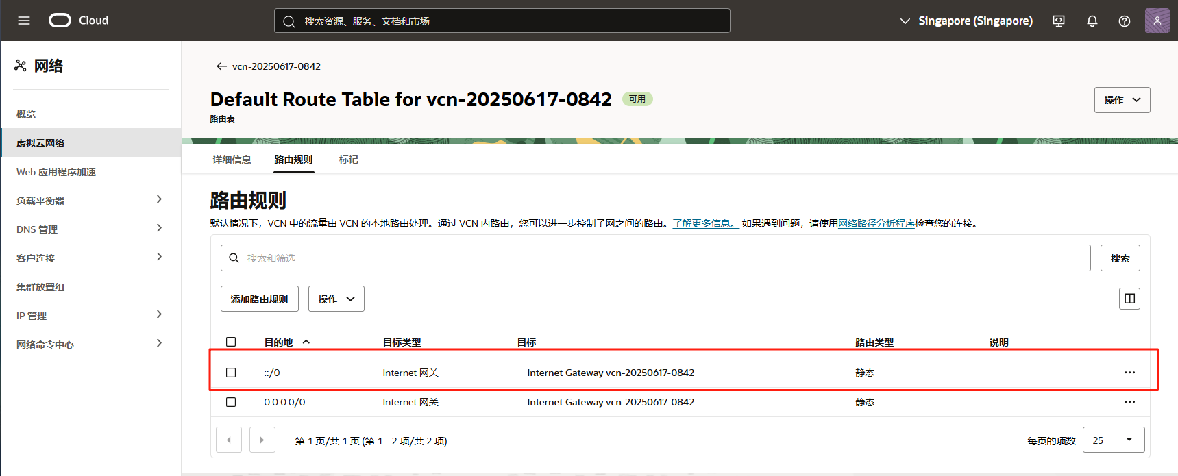 三、配置路由表以允许 IPv6 互联网访问 需要为子网关联的路由表添加一条规则,将所有目标为外部 IPv6 地址的流量(::/0)指向互联网网关。 在 VCN 详情页面,点击菜单中的 路由,选择子网默认关联的那个路由表,进入路由详情页面。