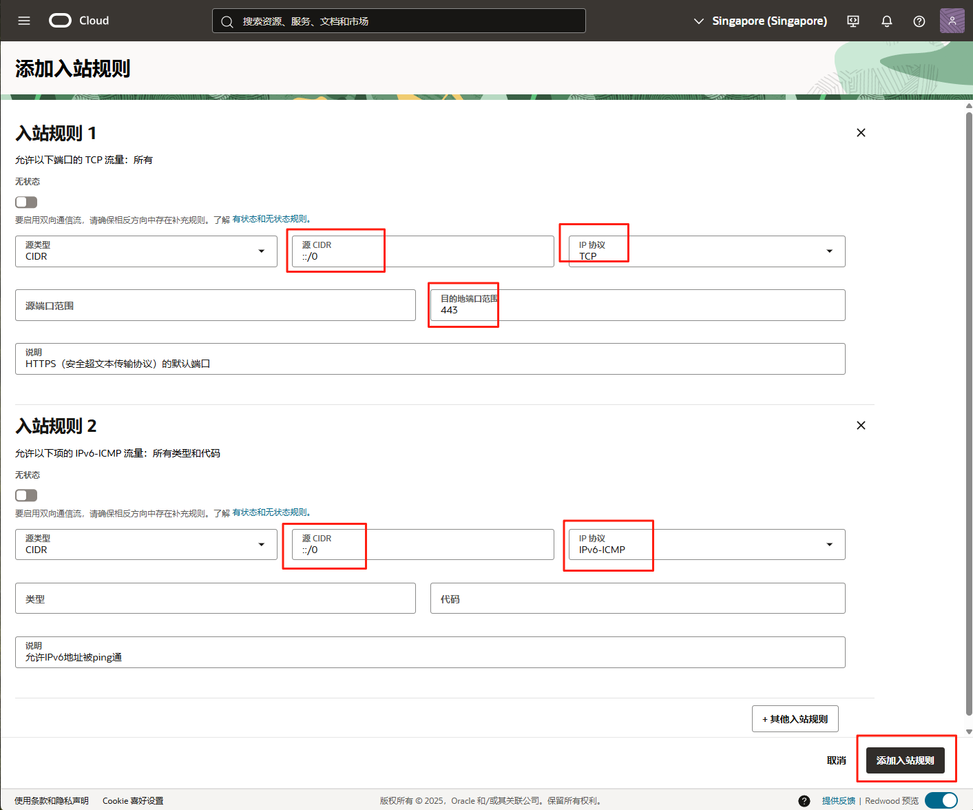 只需要添加必要的 IPv6 流量即可,通常默认允许所有出站协议。下滑点击添加出战规则: 放行所有出站 IPv6 流量(服务器才能使用IPv6上网),目的地类型: CIDR, 目的地CIDR::/0, IP协议所有协议,最后添加出站规则。