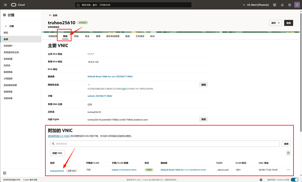 五、为实例 VNIC 分配 IPv6 地址 现在进行关键一步:为实例的网络接口 (VNIC) 分配具体的 IPv6 地址。 导航至 计算 (Compute) -> 实例 (Instances),选择目标实例,在实例详情页面,菜单栏切换到网络,向下滚动到 附加的 VNIC (Attached VNICs) 部分,点击实例的主 VNIC,在 VNIC 详情页面。